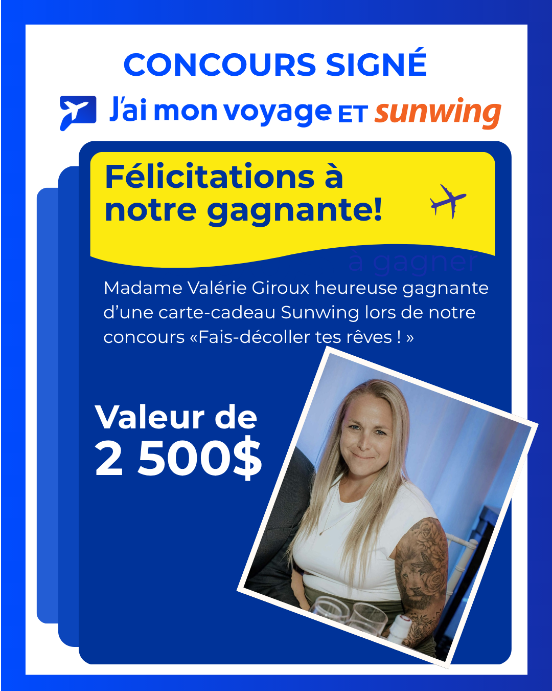 Madame Valérie Giroux remporte la carte-cadeau Sunwing d'une valeur de 2 500 $ lors de notre concours. Toute l'équipe lui souhaite un voyage absolument mémorable!